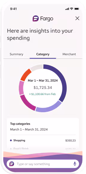 Fargo1 gives you valuable insights like a summary of your spending by category, retailer and across accounts. Find it only in the Wells Fargo Mobile® app.